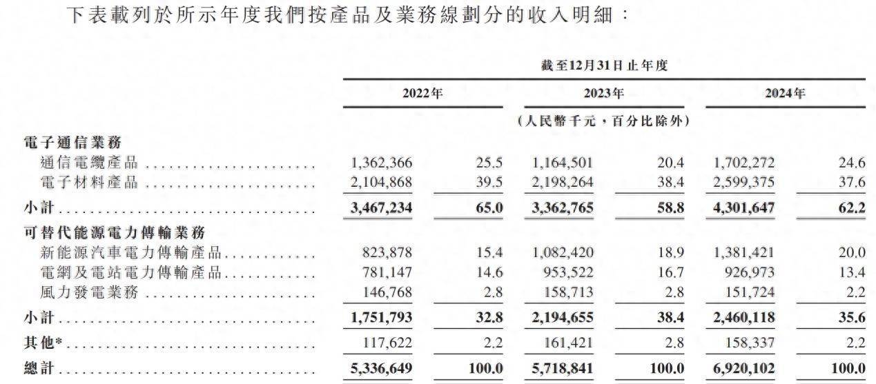 通信电缆产品主要包括高速铜缆、汽车数据通信线、工业自动化 及机器人线缆、消费电子线及医疗线缆,而电子材料产品包括单壁热缩管、双壁管、标识管、连续母排保护套管以及医疗管,覆盖新能源汽车、电力基础设施、轨道交通、通信、航空航天及医疗场景等关键任务型行业。